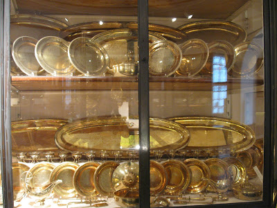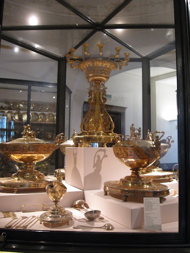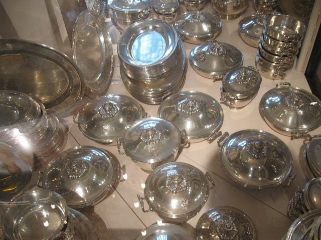 器具上,則都用值錢的金或銀做的餐具,或是採中間策略,用鍍了金的銀(vermeil)餐具。Vermeil用的銀,成本比全金來得便宜(一些些),但鍍了金,卻又有金的外表。這兒展示的Grand Vermeil,共有4500件左右,是世界上最大的vermeil餐具組。原產於法國,在拿破倫戰敗後,這套餐具後來被搬到維也納。由於當時對抗拿破倫時,宮廷裡有價值的金屬都己拿來熔成錢幣作打仗用途,Hofburg裡其實已經沒有像樣的高級餐具可在正式的餐會上使用,因此這套Grand Vermeil來的正是時候。