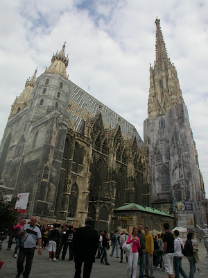 Stephansdom大教堂,經歷過數場戰爭,都有受到相當程度的破壞。最近一次的二次世界大戰末期,一把大火燒得將屋頂給整個塌陷了下來。災後奧地利政府投入大量的物資,迅速將它重建起來,可見他們對於這個國家的精神象徵,是多麼重視的。今天,Stephansdom三不五時,外圍都要整修。我們參觀的這一天,當然也不例外。這張可以清楚看到教堂外牆上鋪上了灰色的一大塊布。雖然布的圖案企圖呈現原本教堂的樣子,但總是有點破壞整體美感就是了。