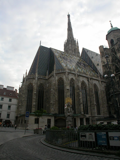 在十二世紀,維也納逐漸變成歐洲重要的城市的時候,城市人民對宗教的要求也相對提高。第一個史蒂芬教堂於十二世紀中左右建蓋的,是羅馬式(Romanesque)風格。幾場大火之後,史蒂芬教堂不斷以哥德式(Gothic)風格重建與擴建。今天的教堂,早期羅馬式沒有被毀壞掉的部份以及後面哥德式的混合體。當然,最顯眼的南塔,於1433年完工,總高136.7米,是哥德式的典型代表。今天,遊客願意花點錢,找點活罪受,爬上343層階梯,則可以在維也納最高處,一覽整個都市的市容。北塔,原本是要比照南塔的,只不過神聖羅馬帝國的荷包縮小了,所以蓋到後來就決定不再蓋了。只是,這時哥德式風格已經退流行了,所以就配了一個文藝復興風(Renaissance)的圓屋頂。北塔只有68米,差不多是南塔的一半高而已。同樣地,花點錢,也是可以上北塔的。不過,這個比較享受,是坐電梯上去的。北塔上,其實有另一個奧地利的國寶,也就是Pummerin大鐘,是歐洲第三大的鐘,光直徑就有三公尺了。我們沒有多花錢和時間的意願,所以二者都沒上去。