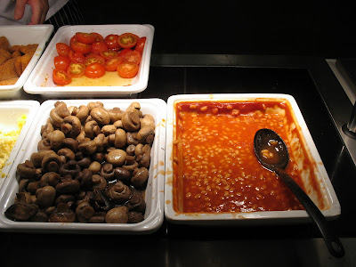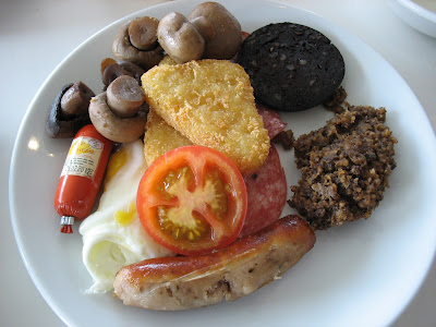 還是拿了一盤就是了。右上角黑黑的那個算是蘇格蘭版的豬血糕。右邊那一陀就是haggis了。自從早餐也吃到haggis後,我就發誓在愛丁堡這趟再也不碰這種東西了。