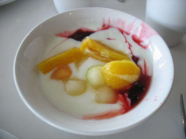 這一天早餐我們兩人很奢華地點了Holiday Inn的breakfast buffet。看冷食還算正常,有歐洲的火腿肉和起士。