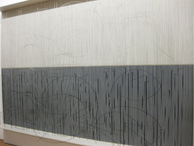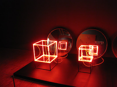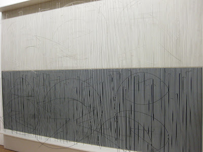 一般而言,許多現代藝術對我來說有點太詭異。有些作品沒有「直覺性」的美感就算了,但很多東西的設計還會讓人極不舒服,有時甚至令人作嘔。雖然許多呈現shocking value的東西,往往是被歸類為藝術的,但很多東西,我只能說,I don't get it。讓我印象深刻的,應該就是去年同一個會在Graz的時候,我們也是免費到Graz的美術館看作品展覽。看完之後的感覺,就是不斷出現的三條線~~