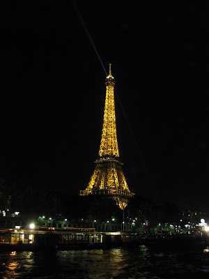 等到船駛到它的正方時,這時開始閃燈了~~!原來鐵塔晚上整點的時候都會閃燈,為時五分鐘。儘管船上的人大多是受教育極高的「知識份子」,但看到亮晶晶的巴黎鐵塔,也都變成了一般的觀光客,「嘩」聲不斷,而且拿出相機狂拍。我們也不例外,呵呵。