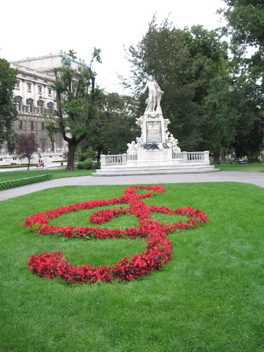 Hofburg宮旁有個花園,叫Burggarten。前來這個花園的人,大多都是衝著裡面的莫札特像而來。像之前有個小草坪,有紅花排出來的高音譜記號的圖案。