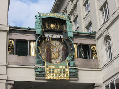 Hoher Markt這兒最有名的東西,應該是那個Ankeruhr鐘。1911由Vienna Secession時期的藝術家Franz von Matsch設計打造,這個鐘位於Anker保險公司兩棟大樓之間。十二小時之內,共會有十二位維也納歷史上重要的人物會從一側走到另一側。正午十二點的時候,是唯一次可以同時看到十二位人依序出現,而且還會有搭配音樂奏出,會是一天最熱鬧的時刻。十二位名人裡,有奧地利女王Maria Theresa,Belvedere的Eugene王子,還有作曲家海頓。我們到的時候,是下午,很可惜地啥也沒見到 :(